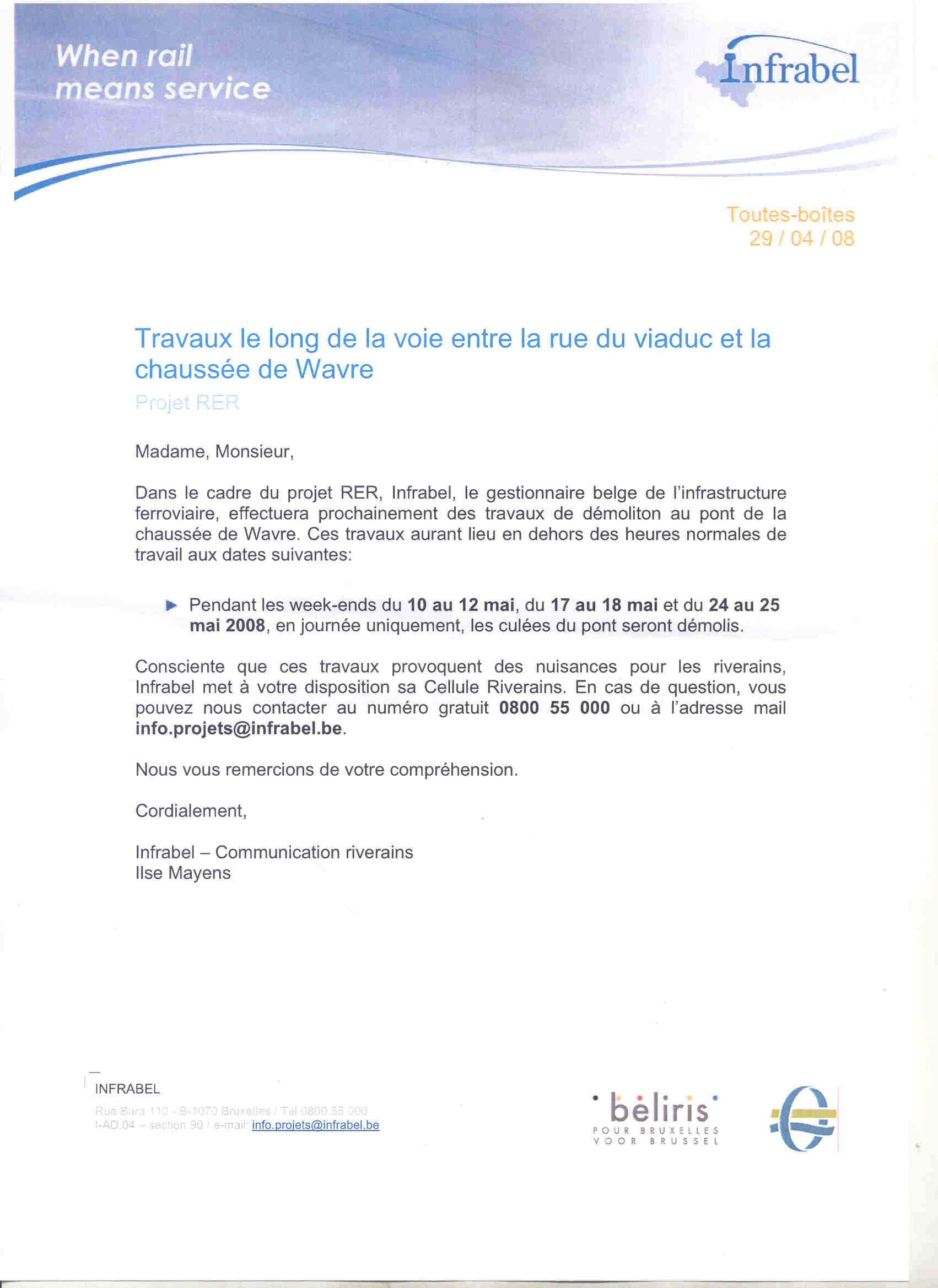 Si vous avez des plaintes, suivez leur procédure : envoyez un e-mail à info.projets@infrabel.be et/ou appelez le numéro gratuit 0800 55 000