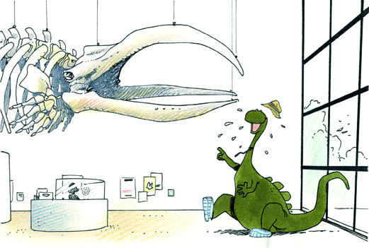 Nous on est du quartier, alors on est venu a pied et en poussette. Dans le hall du musée, je découvre un dessin de Frank Pé sur la première page d’un dossier du Soir consacré à l’ouverture de la nouvelle galerie des dinosaures. Lui aussi il est du coin ! Décidément, je vais de surprise en surprise depuis mon emménagement.