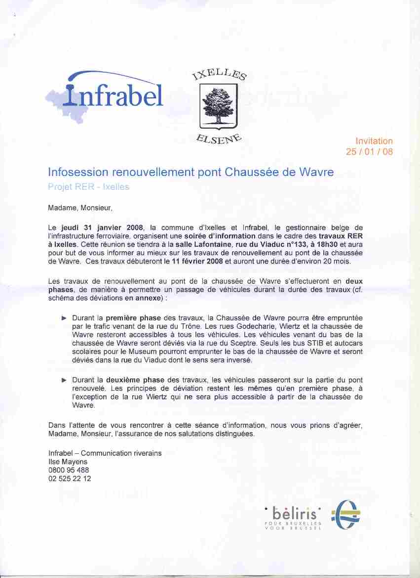 Nous mettons en ligne le schéma de circulation dans le quartier que les autorités se proposent de mettre en œuvre en 2008 et 2009 pendant les travaux de reconstruction du pont de la chaussée de Wavre. En cliquant sur l’image, vous pouvez l’agrandir. Idem pour l’Invitation qui a été adressée par 3 autorités (Commune d’Ixelles, Beliris et Infrabel-SNCB) pour une réunion d’information ce jeudi 31 janvier à 18h30 au 133 rue du Viaduc. Les membres de l’AQL et les riverains y seront nombreux et attentifs.