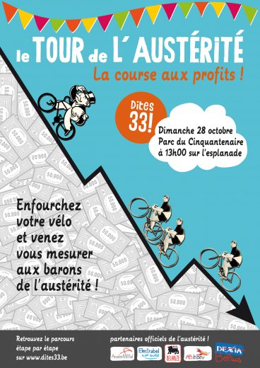 En effet, le dimanche 28 octobre, cinq équipes cyclistes s’élanceront pour le « Tour de l’austérité ». L’occasion pour les « barons » de l’austérité - Delhaize, Electrabel, InBev, Arcelor-Mittal, Belfius – d’engranger de nouveaux profits, dans une course pensée et organisée par les instances politiques belges et européennes.