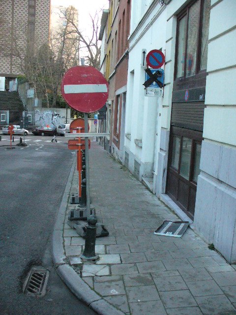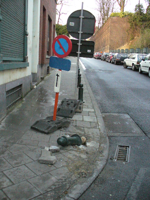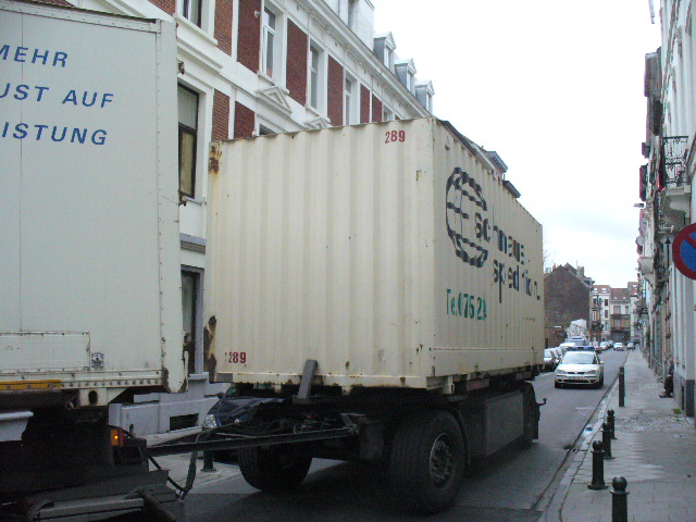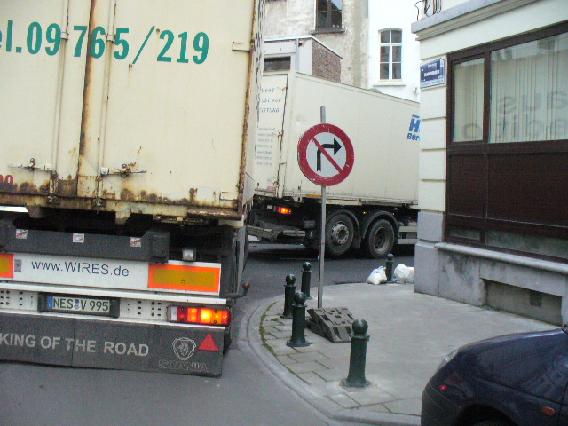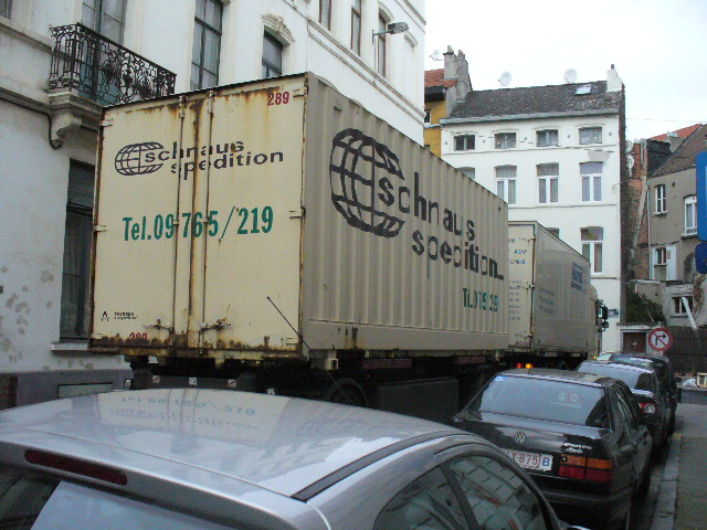 Le camion avec remorque mesurait environ 23 m ! Il a fallu l’intervention des services de police (Tél. au 101) pour lui permettre de tourner à droite dans la rue du Viaduc. L’ouverture pour tourner à gauche et remonter la rue du Viaduc étant plus faible suite au stationnement et à sa disposition (coté droit avec oreille) dans la rue Vandenbroeck. Voir les photos 1, 2 et 3., des photos prisent le 10 mars 2008 entre 10h00 à 10h30. Nous pouvons remarquer le véhicule de police sur la photo 2.