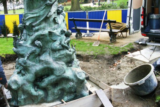 Je revenais de la place du Jeux de balle et pris mes raccourcis pour remonter à Ixelles. Ainsi je me trouvai au parc d’Egmont et voulus rendre hommage à un petit bijou de la sculpture, la statue de Peter Pan, copie de la célèbre statue de Kensington Gardens à Londres, don du sculpteur Georges Frampton à la ville de Bruxelles. Disparue, un linceul de terre bien peigné en lieu et place de l’oeuvre inaugurée en 1924 par le bourgmestre Adolphe Max.Pas de quoi me guérir du syndrome de Peter Pan qui m’habite.Déjà une petite intrigue m’avait tarabusté le cervelet. Notre copie belge nous présente un Peter Pan sans sa flute. De là, à un évanouissement total de l’hommage au roman de J.M Barri, il y a une marge.