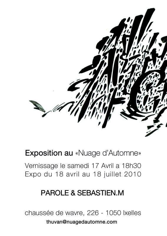 N’oubliez pas , ce Samedi 17 Avril, à partir de 18h30, vous êtes cordialement invités au vernissage de la nouvelle exposition Parole et Sébastien M. au Nuage d’Automne.